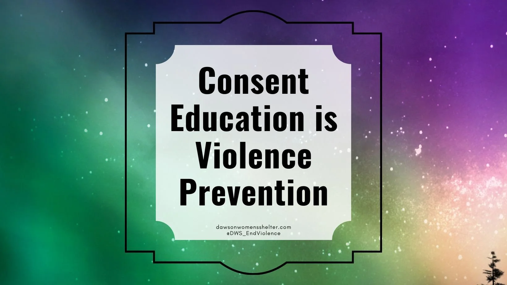 Image description: Text 'Consent Education is Violence Prevention' on background of colourful northern lights