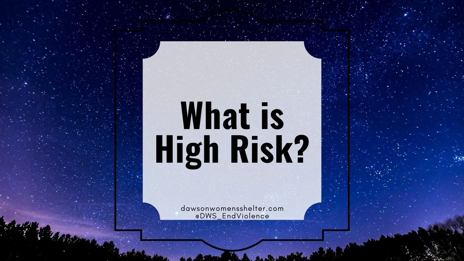 Image description: Text “What is High Risk? dawsonwomensshelter.com, @DWS_EndViolence” on a background of a starry night